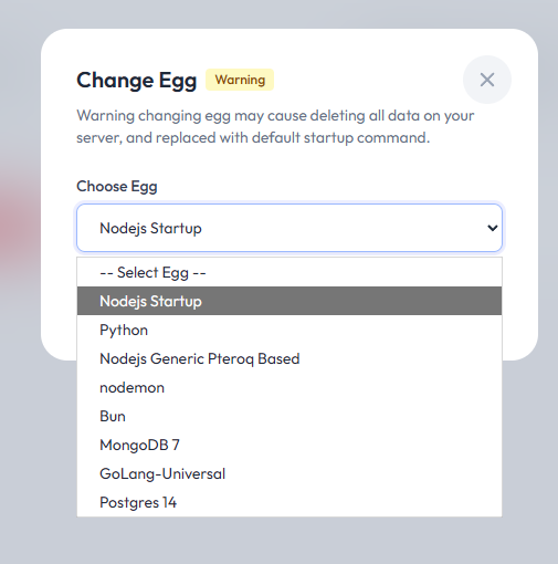 Pilih environment (egg) yang ingin kamu gunakan sesuai kebutuhan aplikasi atau game server kamu.
